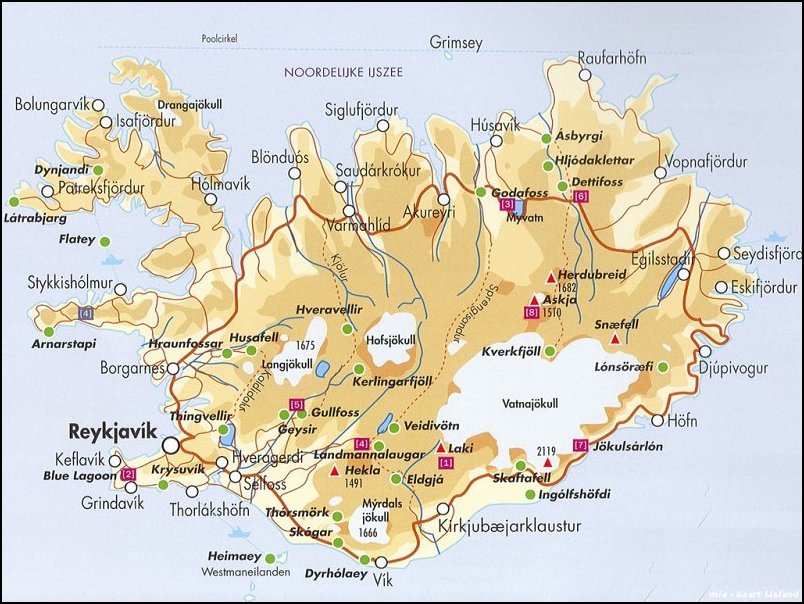 Geografie De oudste delen van het eiland zijn 17 tot 20 miljoen jaar oud. Dit gebied ligt in het noordwesten en wordt in het IJslands de Vestfirðir (Westfjorden) genoemd. Het eiland groeit als gevolg van vulkanisme nog steeds aan. Het jongste deel is het eilandje Surtsey dat bij de Vestmannaeyjar ontstond tijdens een vulkaanuitbarsting die in 1963 begon (en slechts 3,5 jaar later eindigde). Het eiland is hoofdzakelijk opgebouwd uit vulkanisch materiaal en gesteente, omdat het op de Midden-Atlantische rug ligt, het scheidingsgebied van een aantal tektoniekplaten die langzaam uit elkaar drijven, waardoor het onderliggende magma de kans krijgt naar de oppervlakte te komen en daar de ontstane scheuren op te vullen. Een deel van die Midden-Atlantische rug loopt van noord naar zuid door het midden van het land en verheft zich daarbij zo ver, dat het als het ware heel IJsland boven het zeeoppervlak uittilt. Als gevolg van de platentektoniek drijven sommige delen van IJsland daarbij met een gemiddelde snelheid van zo'n 1 à 2 cm per jaar gestaag uiteen. Þingvellir, zo'n 50 kilometer ten oosten van Reykjavik, is de enige plaats ter wereld waar men de scheiding van de Amerikaanse en de Europese continentale plaat kan zien. Een bijkomstigheid is dat IJsland ook nog eens op een hotspot ligt. Dat zijn plaatsen in de aardkorst waar het onderliggende magma tot zeer dicht onder het aardoppervlak kan komen. Beide fenomenen zorgen ervoor dat IJsland vulkanisch zeer actief genoemd mag worden. Het land kent een aantal actieve vulkanen, waaronder de Katla onder de Mýrdalsjökull, het Laki-gebied, de Hekla, en het nieuwe eiland Surtsey. In april 2010 zorgde een krachtige uitbarsting van de vulkaan onder de Eyjafjallajökull voor problemen, met name voor het vliegverkeer. Andere, of slapende vulkanen zijn de schildvulkaan Skjaldbreiður, de twee Snæfell-vulkanen, Kerið, Eldborg, Hverfjall, Krafla en Askja. Daarnaast komen er pseudokraters voor, met name bij Mývatn, Kirkjubæjarklaustur en in de buurt van Rauðavatn bij Reykjavik. |