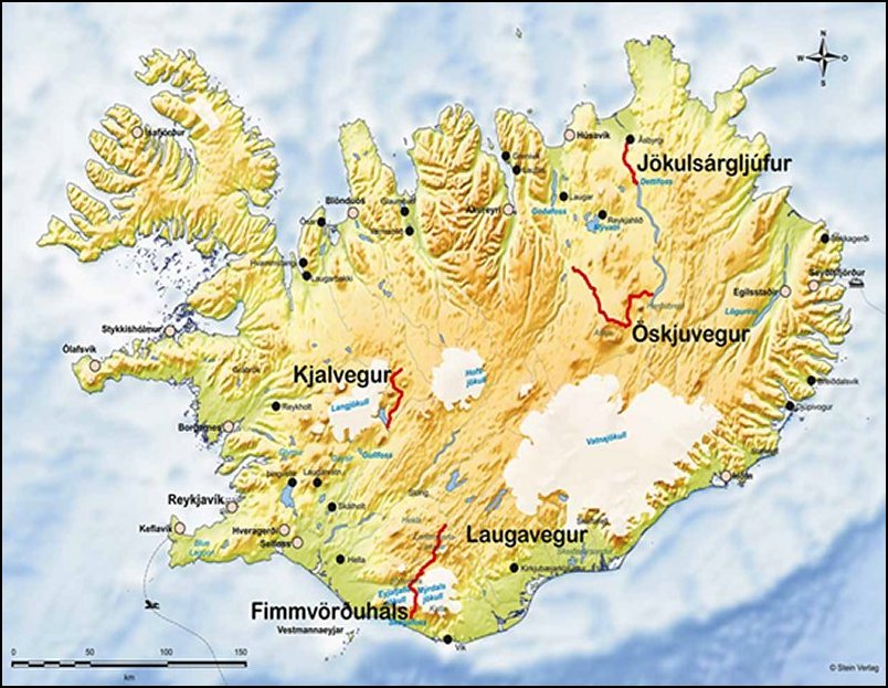 Landschapskenmerken IJsland bestaat voor het overgrote deel uit laag- en middelgebergte, al dan niet met gletsjers bedekt, van waaruit vele rivieren naar zee stromen. Sommige daarvan vervoeren zeer grote hoeveelheden water, maar ze zijn doorgaans voor schepen onbevaarbaar door de snelle stroming. De hoogste berg is de Hvannadalshnúkur. Deze ligt met zijn 2110 meter hoogte grotendeels verscholen onder de Öræfajökull. Bomen komen op IJsland vooral in dwerg- en struikvorm voor, bijvoorbeeld in het natuurreservaat Þórsmörk. Alleen in het oosten van het land komt een gebied voor dat 'bos' mag genoemd worden, het 2000 hectare grote Hallormstaðaskógur. De bomen zijn daar voor het grootste deel aangeplant. Grote boomstammen die men soms langs de kust aantreft, is drijfhout dat van ver is gekomen. Het binnenland is vrijwel onbewoond; het dichtstbevolkte gebied ligt aan de zuidwestkust rond Reykjavik. Langs het noorden van het eiland stroomt de koude Oostgroenlandstroom, langs het zuiden de warme Golfstroom. Gekoppeld aan de wind die vaak van zuid naar noord over het eiland waait, is het klimaat in Reykjavik (zuidwest) kouder dan in Europa, maar nog steeds gematigd. In het noordelijke Akureyri daarentegen zijn de temperatuurschommelingen vanwege de vaak aflandige wind groter. Vanaf de Vestfirðir in het noordwesten via het noorden tot aan het oosten van het land wordt de kustlijn gekenmerkt door grotere en kleine fjorden en baaien. Een aantal fjorden is in de wintermaanden alleen over het water te bereiken en is zelfs in de zomer slechts toegankelijk met een terreinauto. Dat is mede de oorzaak van de ontvolking die sinds de Tweede Wereldoorlog in dit deel van het land gaande is. |